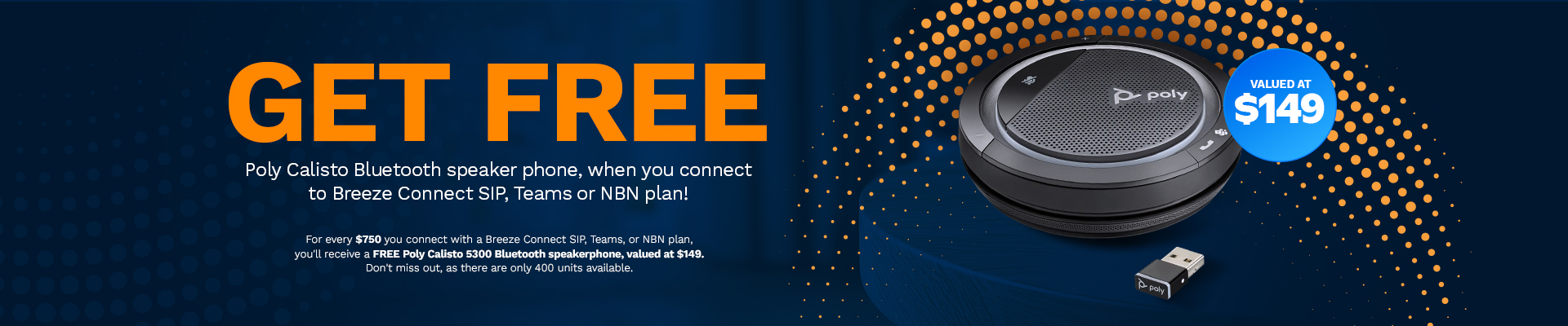 Receive 1 Poly Calisto 5300Bluetooth speaker phone, valuedat $149 free, for every $750connected with Breeze Connect.400 units available, don’t miss out!